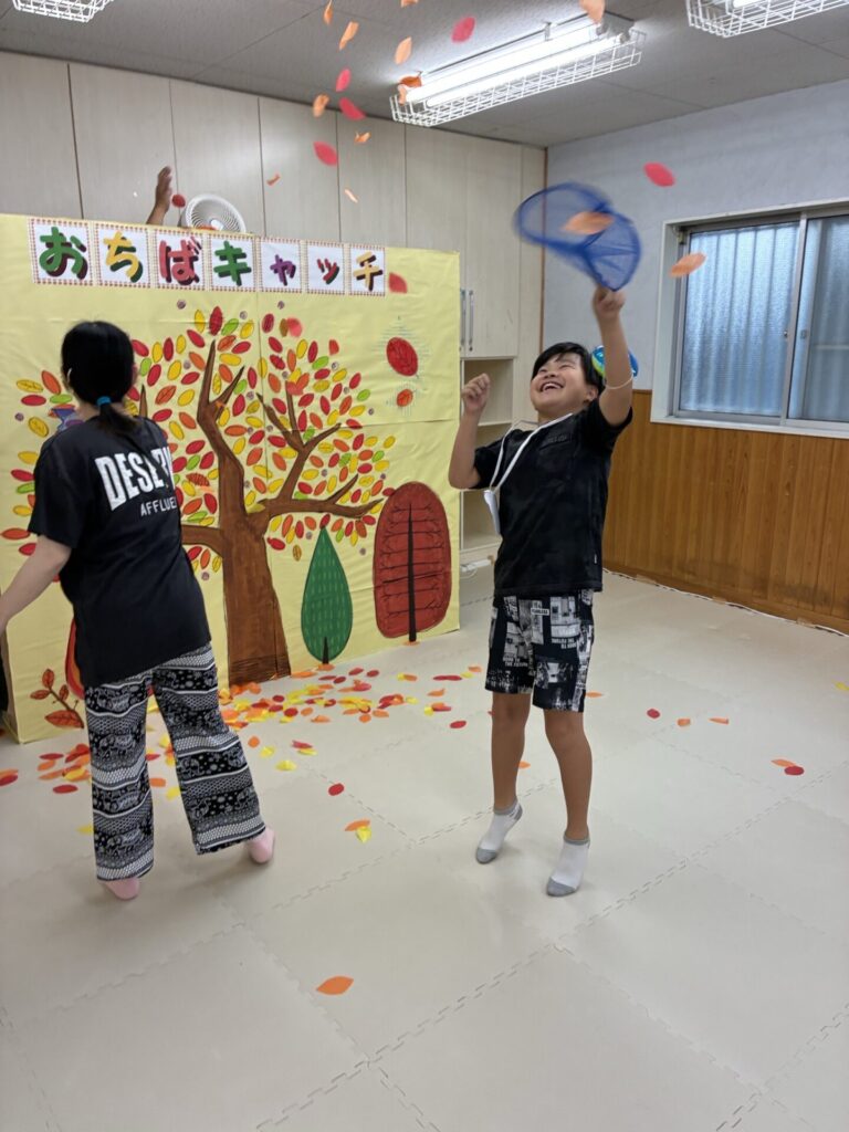 降ってくる色とりどりんの落ち葉を親子で協力して参加してくれました😍