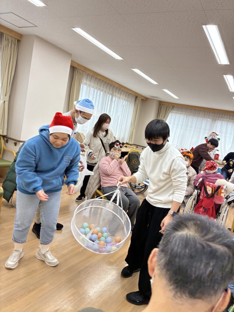 赤組・緑組に分かれて玉入れを行ない、最後にベルを鳴らしながらクリスマスソングを歌い、クリスマスケーキを受け取って持ち帰っています♪みなさん一生懸命に玉を投げてくれていました!ベルも部屋中に鳴り響いていましたね♪それぞれ持ち帰ったケーキが傾いていないことを願うばかりです。