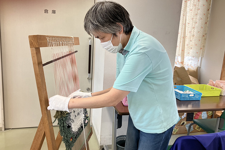 作業は、自主製品としてハンガー組み立て、平織り・結び織りで丁寧に作り上げるマットなどがあります。また、箱の組立てやプラスチック加工などの受注作業にも取り組んでいます。